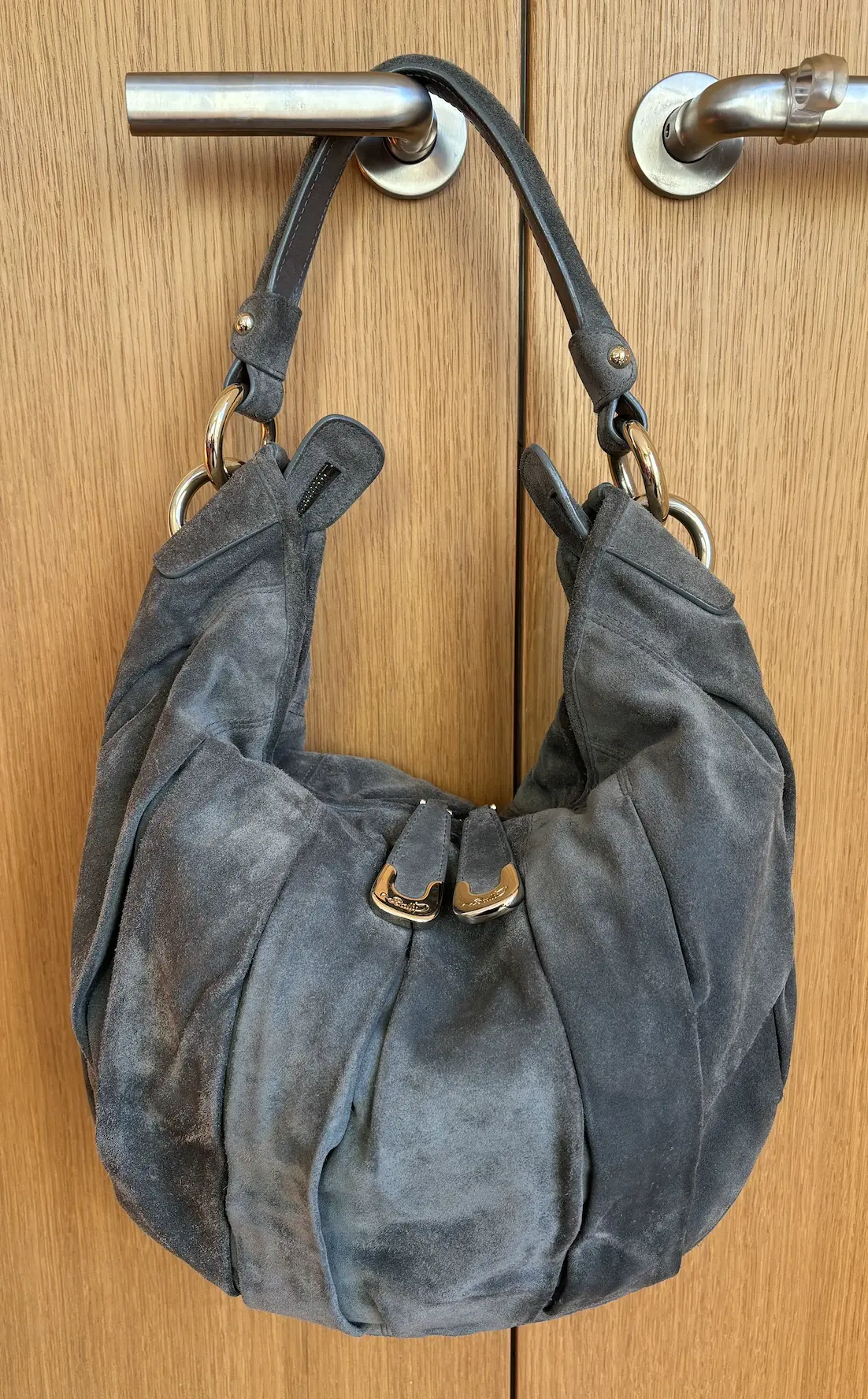 Bally shoulder bag in grey suede. Purchased at Bally store on Bahnhofstrasse in Zurich. Only used a handful of times and in excellent condition. Zippers work perfectly. 45 x 34 cm when laid flat. Comes with Bally dust bag.