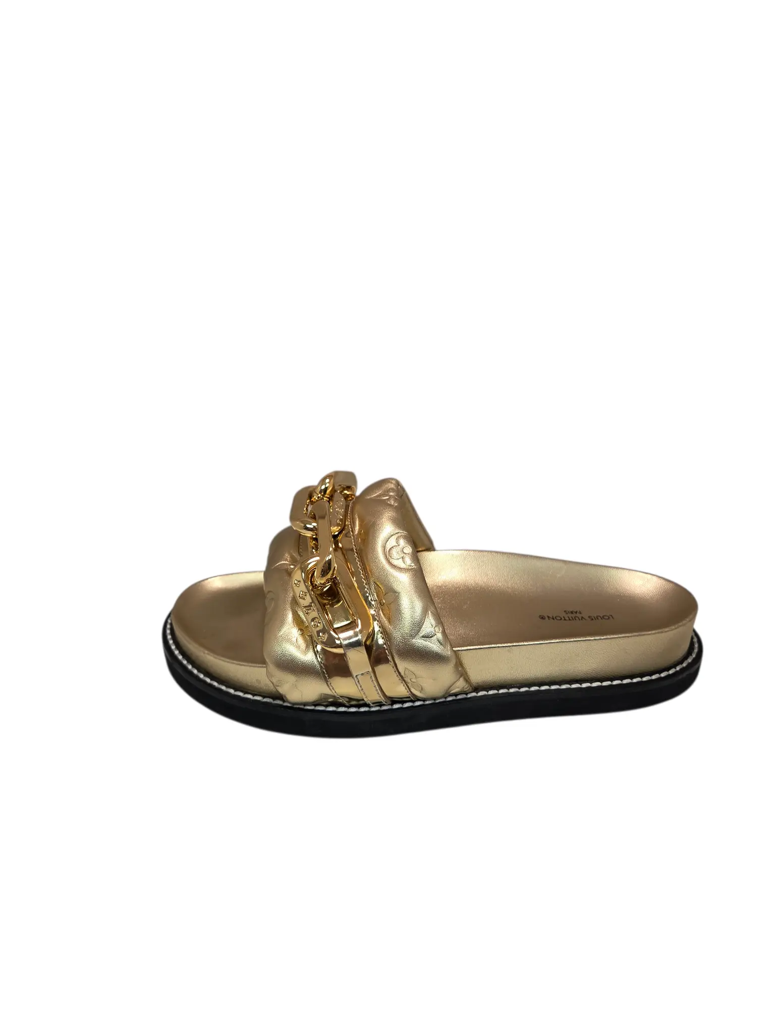 Elevate your summer style with these Louis Vuitton golden slippers! Size 40, these stylish slides are the perfect blend of luxury and comfort. Featuring a unique unicolour design and chic chain detailing, they are sure to turn heads wherever you go. they are worn just once and in excellent condition