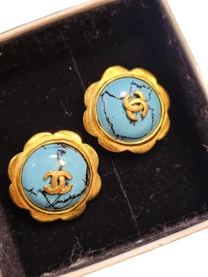 These Chanel clip earrings feature a striking combination of blue and gold, crafted with gold plating and embellished with turquoise stones. With a size of 25.00 mm x 25.00 mm, they are a stylish accessory for any occasion. The earrings are part of the 97P collection and are characterized by the Coco Mark motif.